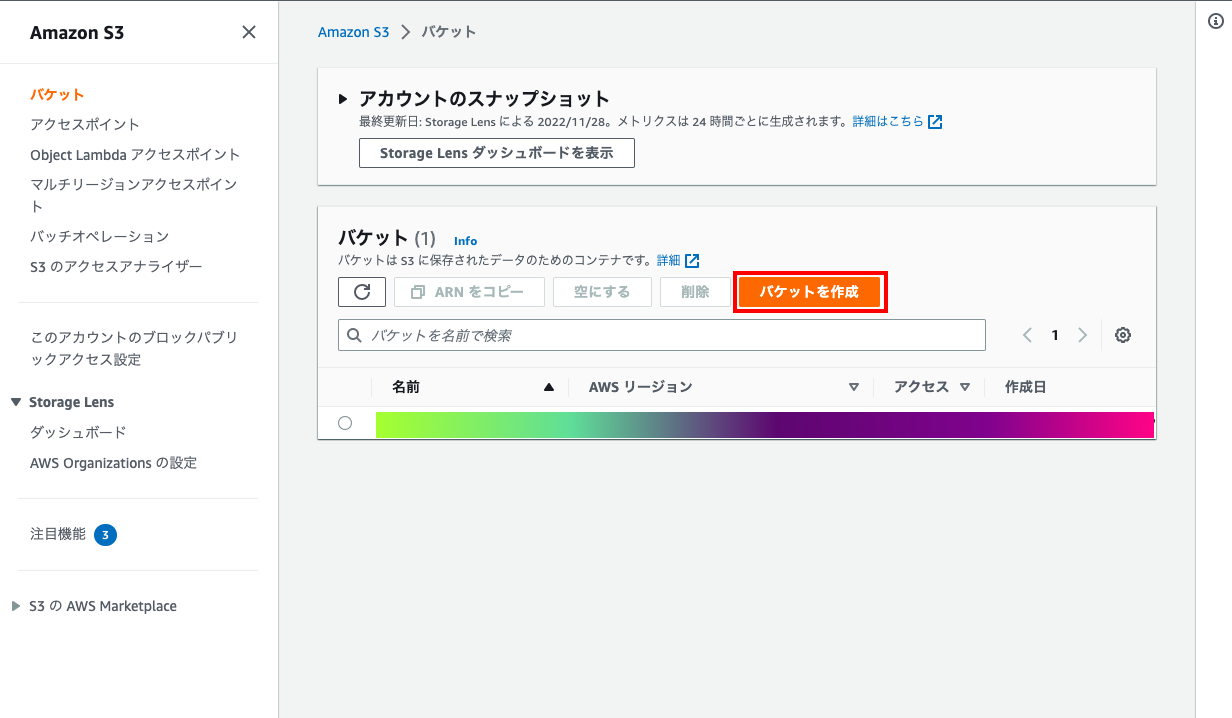 - AWSコンソールからS3にアクセスする。