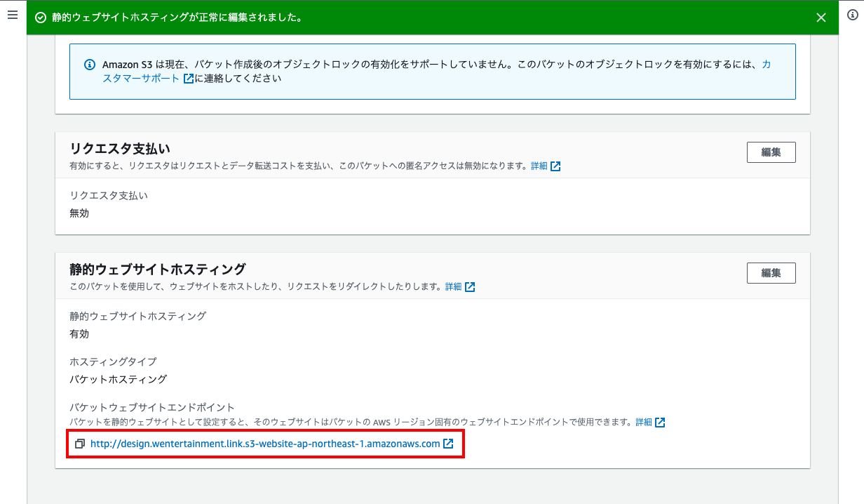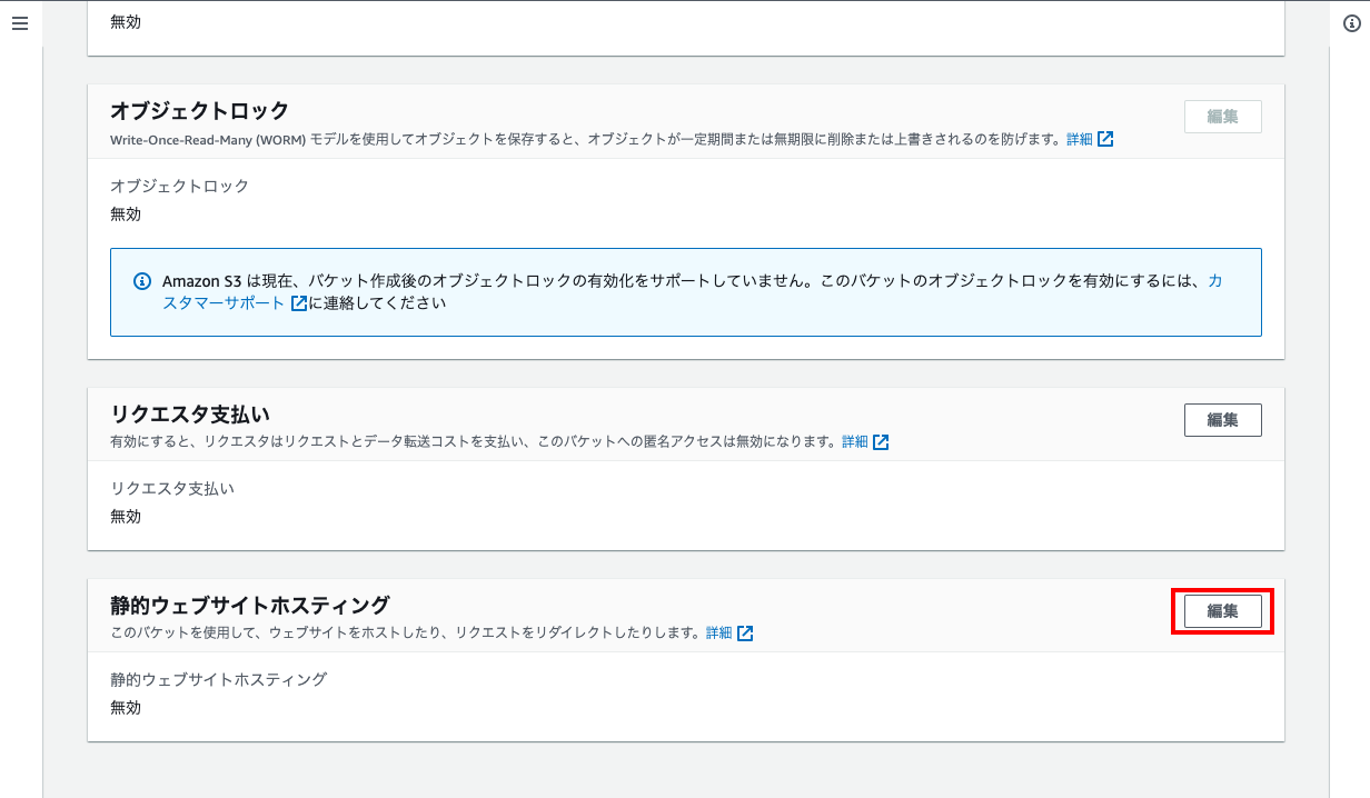 - 作成したバケットのプロパティタブの下部にある「静的ウェブサイトホスティング」の「編集」をクリックする。
