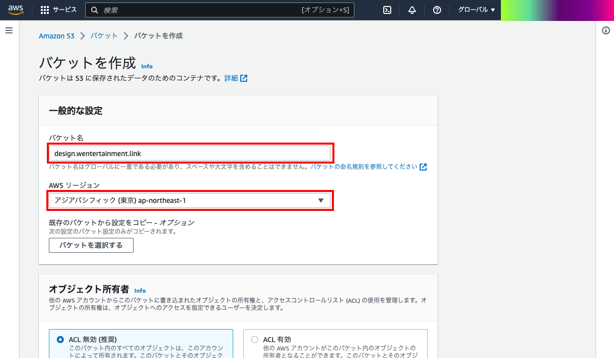 - バケット名に、公開したいWEBサイトの「ドメイン名」を入力。リージョンは、日本のユーザー向けなら東京リージョンを選択。