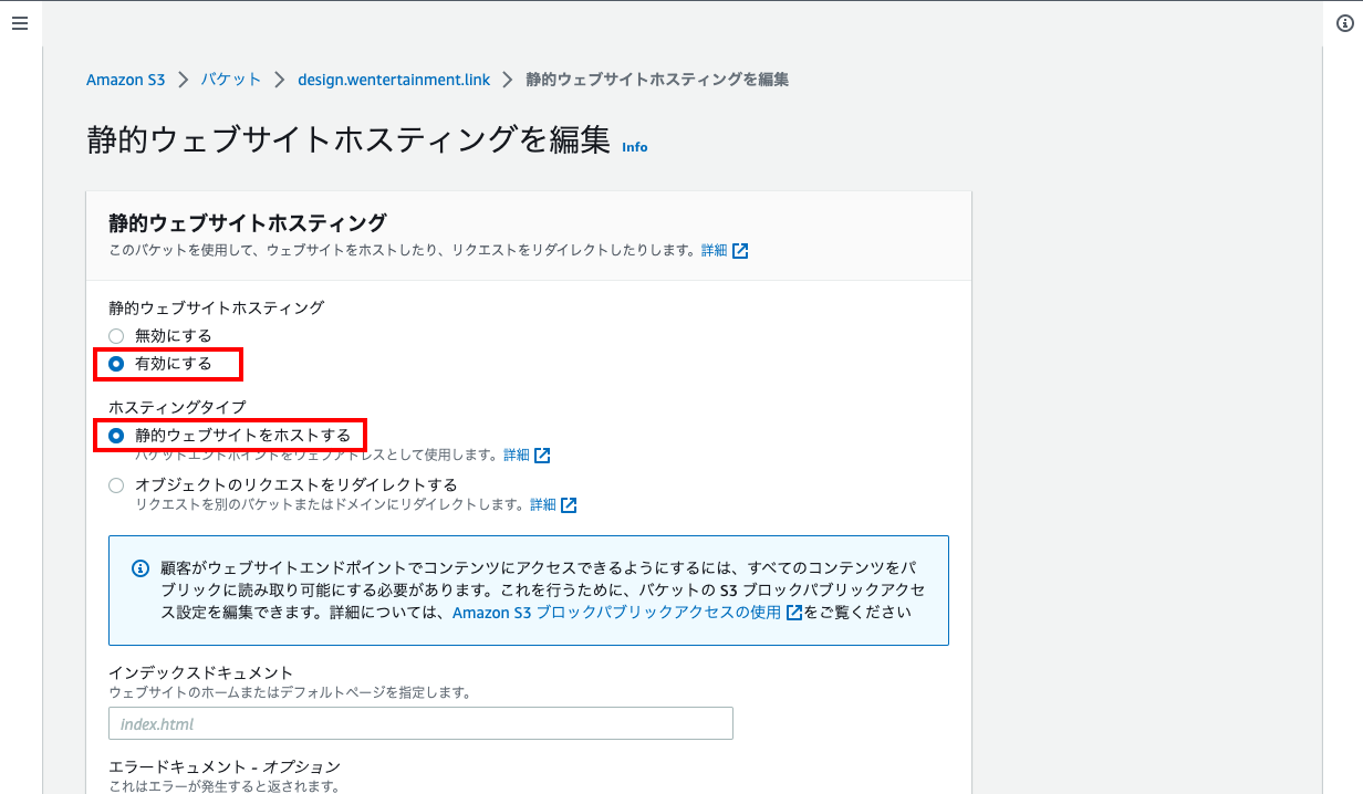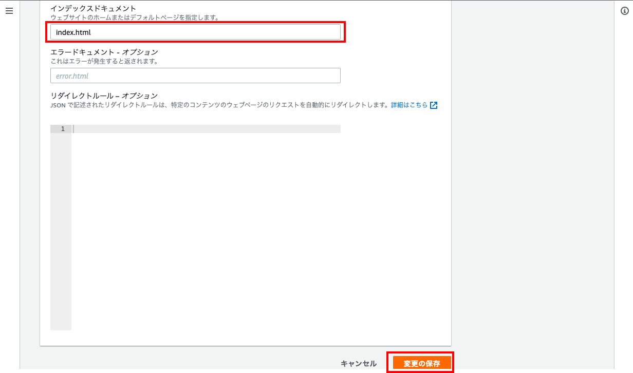 - 「静的ウェブサイトホスティング」で「有効にする」を選択、「ホスティングタイプ」で「静的ウェブサイトをホストする」を選択、「インデックスドキュメント」に「index.html」を入力、その他はデフォルトのままで「変更の保存」をクリックする。(エラーページを作っていれば、「エラードキュメント」にそのファイル名を入力)
