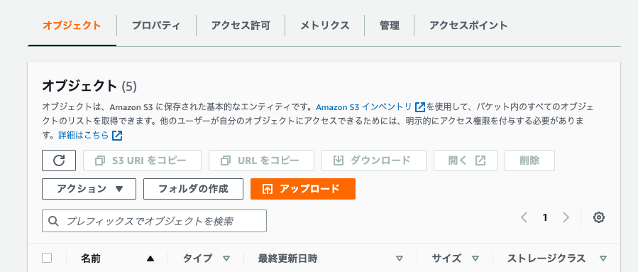 - バケットのオブジェクトタブの「アップロード」ボタンから、WEBサイトのファイル一式をアップロードしておく。この時、TOPページのファイル名は「index.html」とすること。