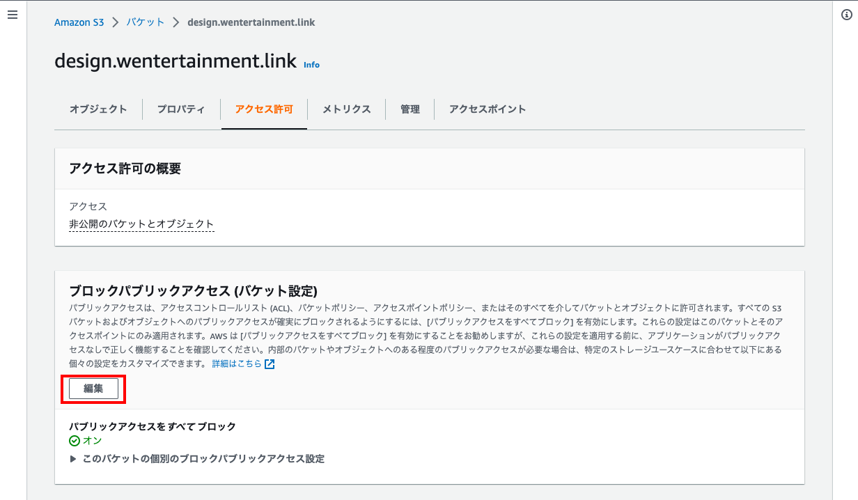 - 次にアクセス許可タブの「ブロックパブリックアクセス」の「編集」をクリックする。