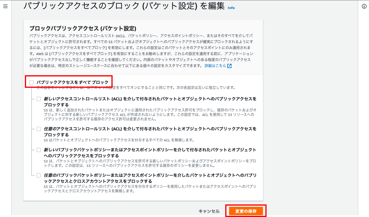 - 「パブリックアクセスをすべてブロック」のチェックを外し、「変更の保存」をクリックする。