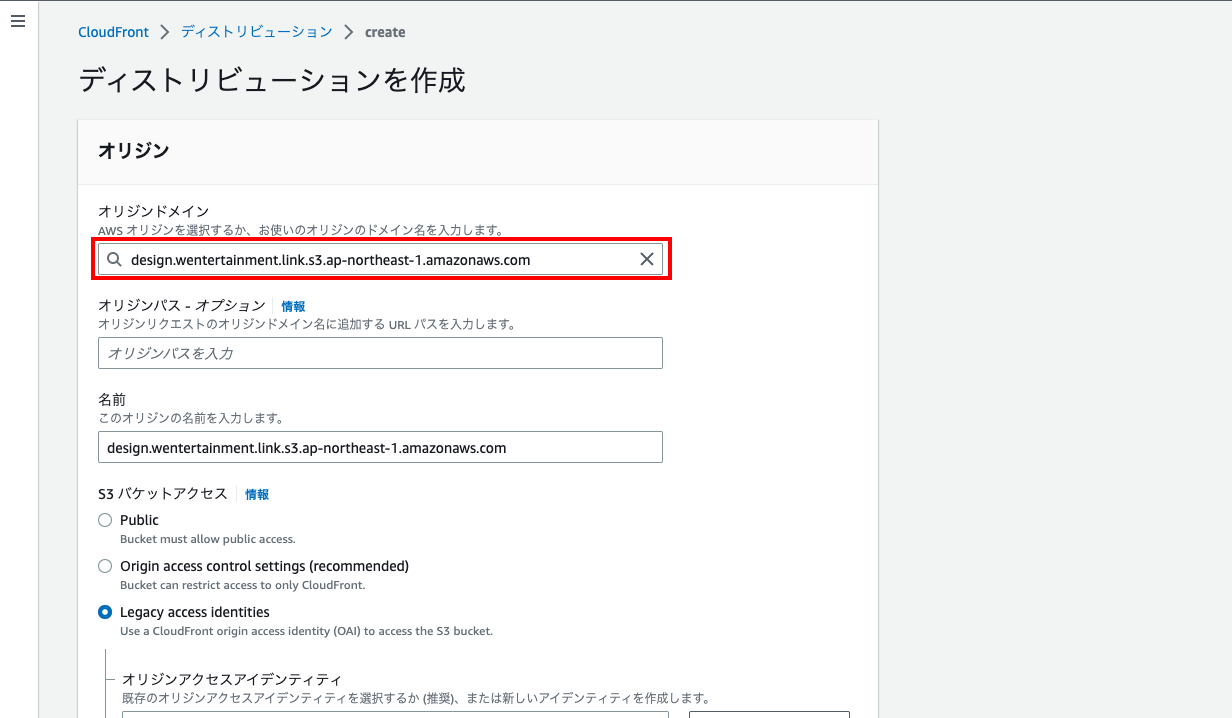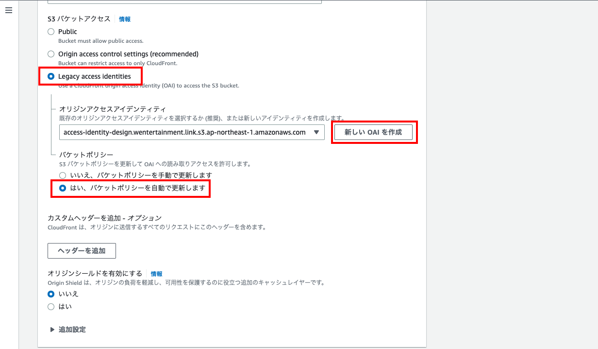 - 「S3 バケットアクセス」は「Legacy access identities」を選択、「オリジンアクセスアイデンティティ」は「新しいOAIを作成」をクリック、「バケットポリシー」は「自動で更新」を選択。