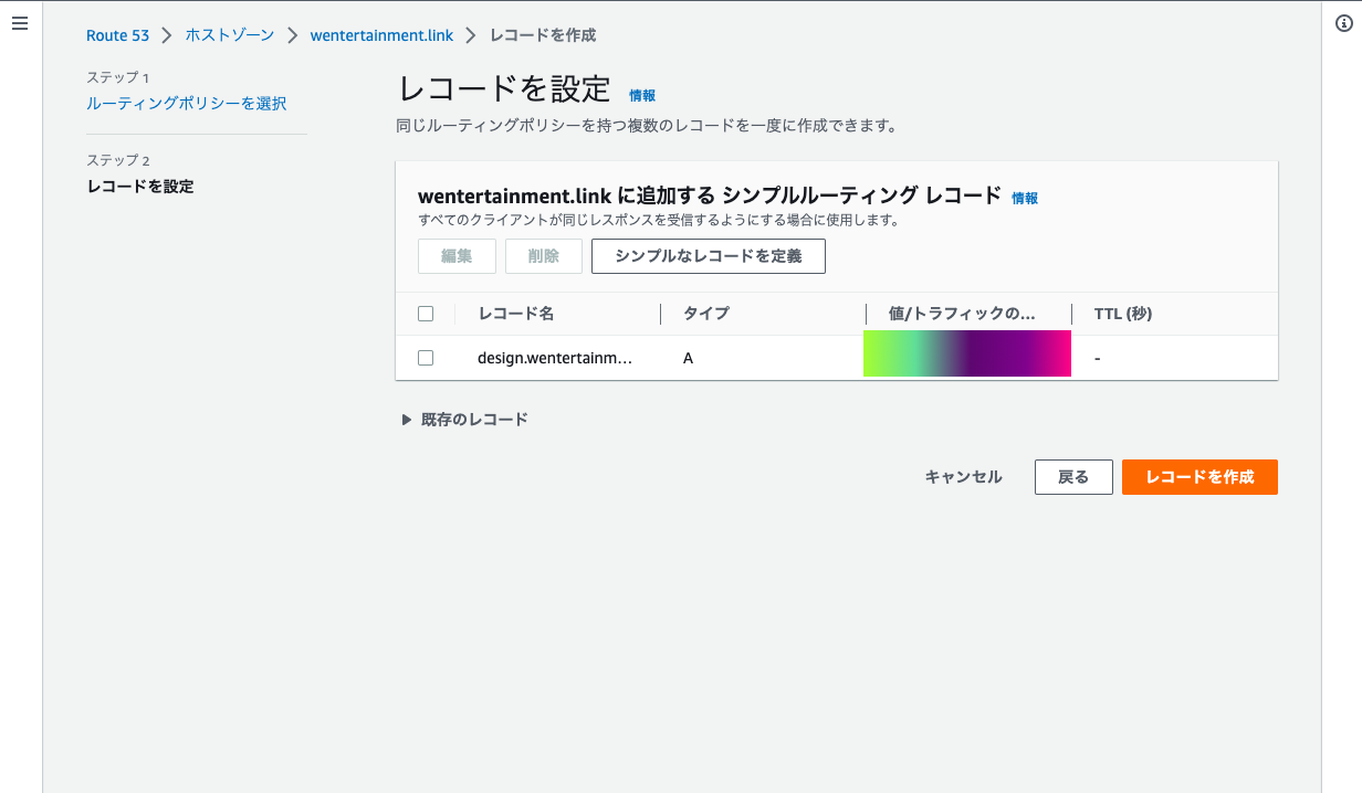 AWSコンソールでRoute53にアクセス。 - 「ホストゾーン」から対象のドメイン名をクリックし、「レコードを作成」を選択。