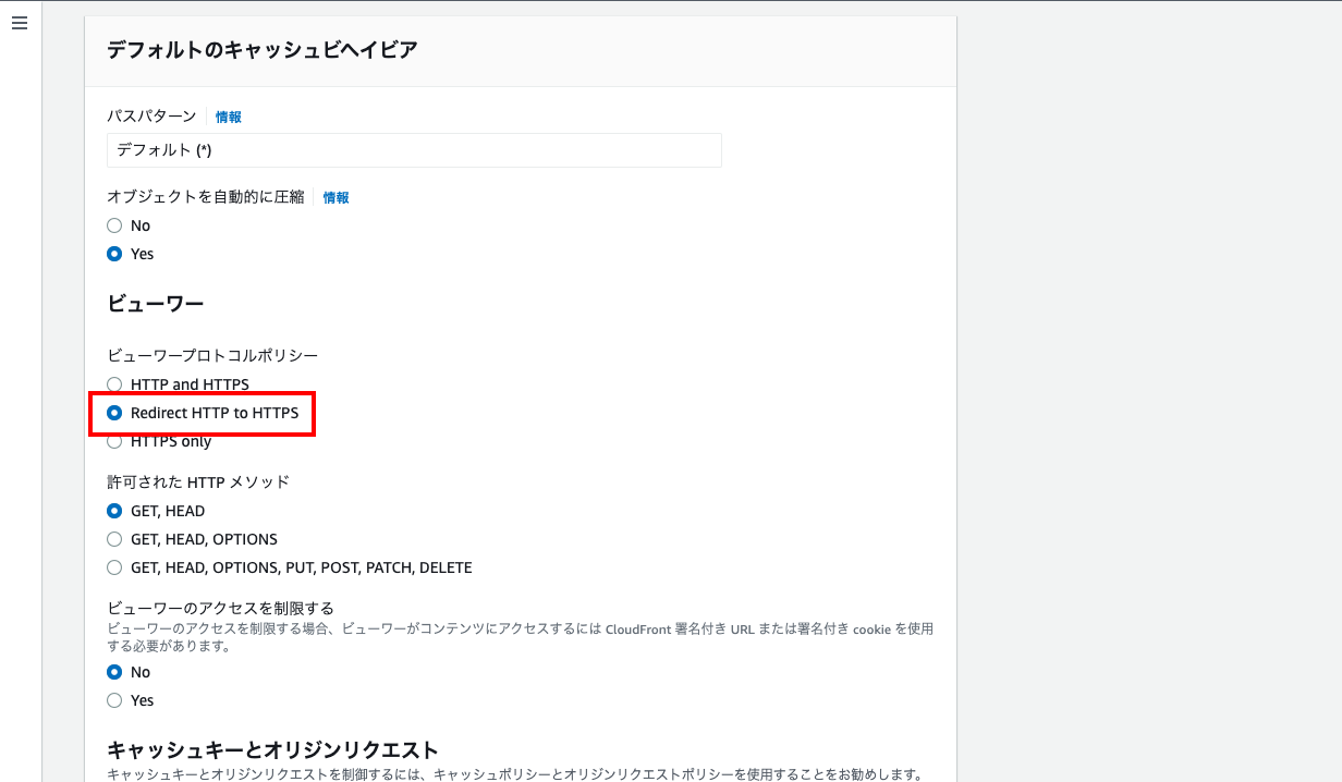 - 「ビューワープロトコルポリシー」は「Redirect HTTP to HTTPS」がオススメ。HTTPでアクセスしてきたユーザーをHTTPSにリダイレクトしてくれる。