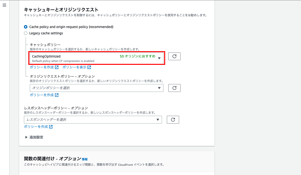 - 「キャッシュポリシー」は「CachingOptimized」を選択。