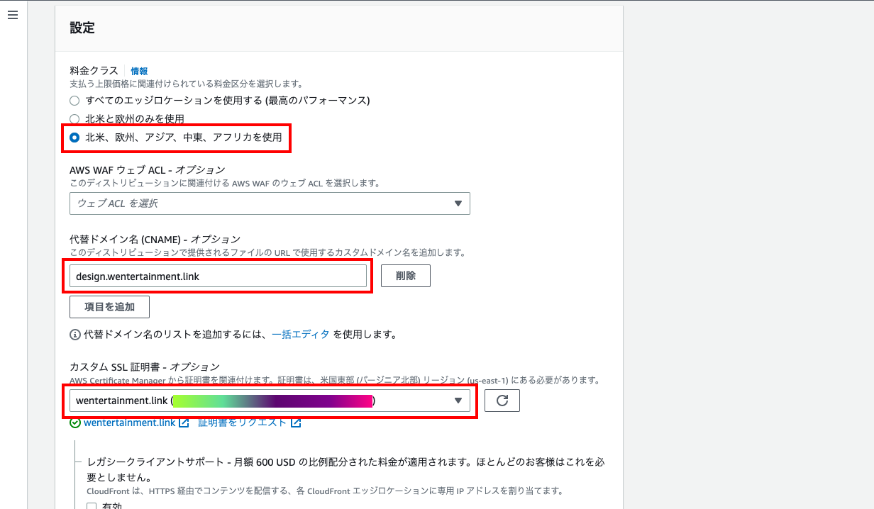「代替ドメイン名」に「ドメイン名(S3バケット名)」を入力、「カスタムSSL証明書」にACMで作成した証明書を選択。