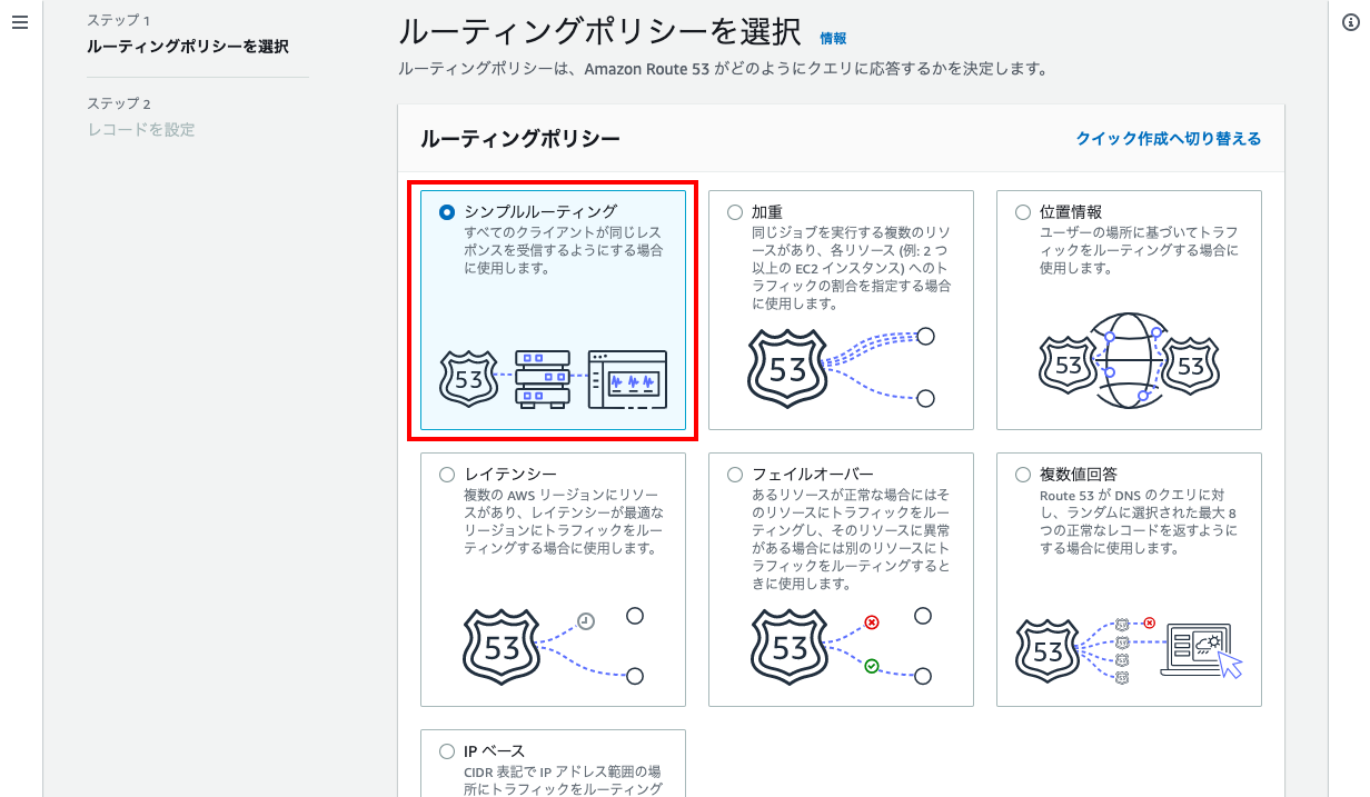 - 「ルーティングポリシー」で「シンプルルーティング」を選択し、「次へ」→「シンプルなレコードを定義」をクリック。