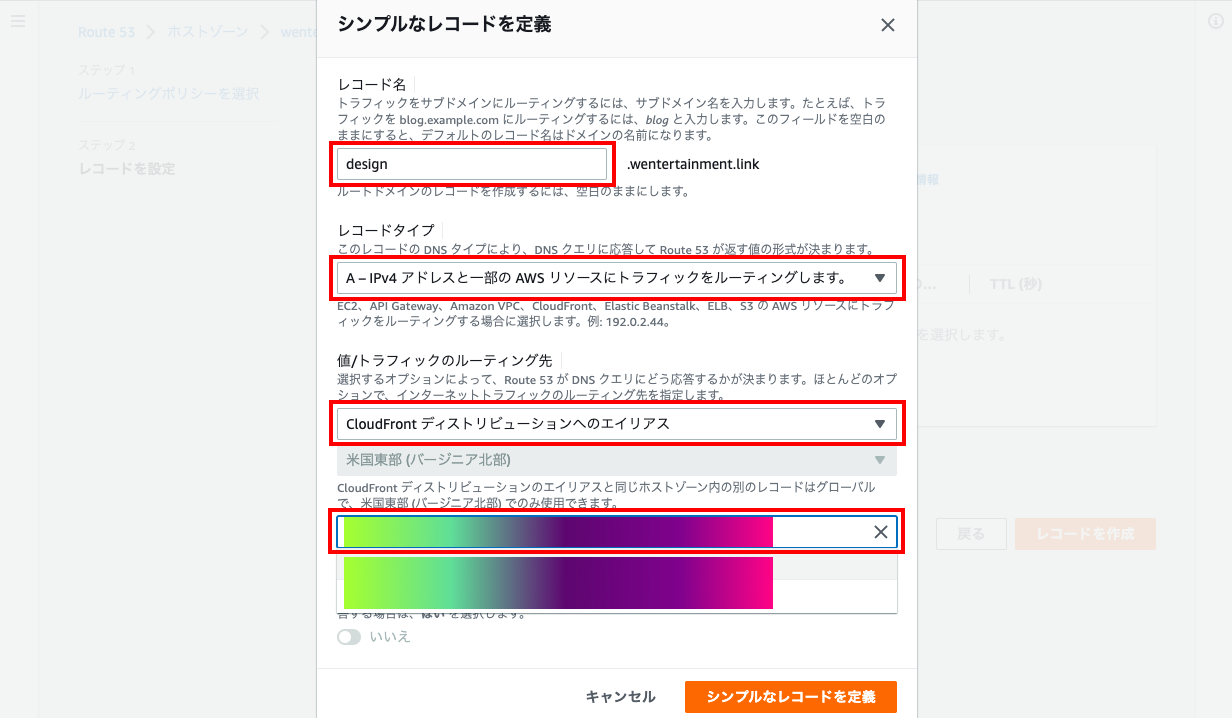 - 「レコード名」はサブドメイン名を入力(ルートドメインの時は空欄)、「レコードタイプ」は Aレコードを選択、「値/トラフィックのルーティング先」は「CloudFront ディストリビューションへのエイリアス」を選択、ディストリビューション名に「作成したCloudFrontディストリビューションのドメイン名」を選択する。