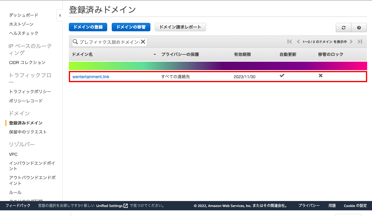 - 登録済みドメインに、取得したドメインが表示されたらOK!完了!