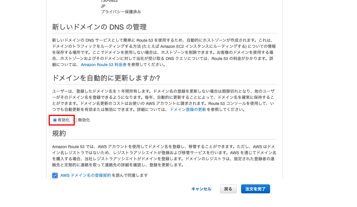 - 入力した情報の確認画面が表示される。ドメインの自動更新は有効化がオススメ。期限切れを気にせず運用できる。