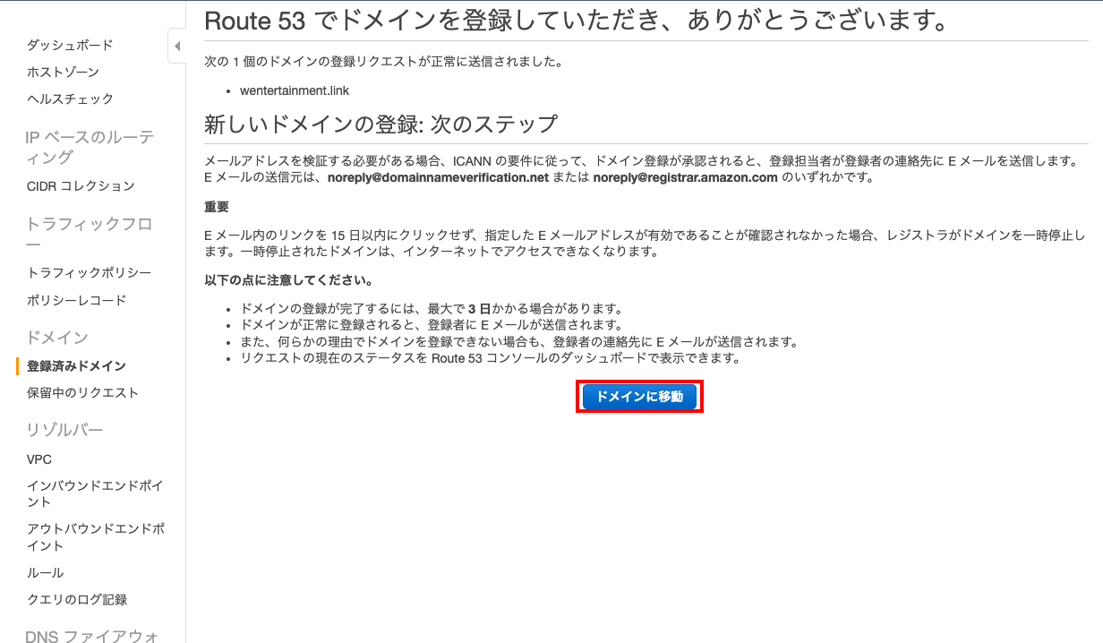 - 注文を完了すると、次の画面が表示される。画面内の注意事項等を確認して、「ドメインに移動」をクリック。