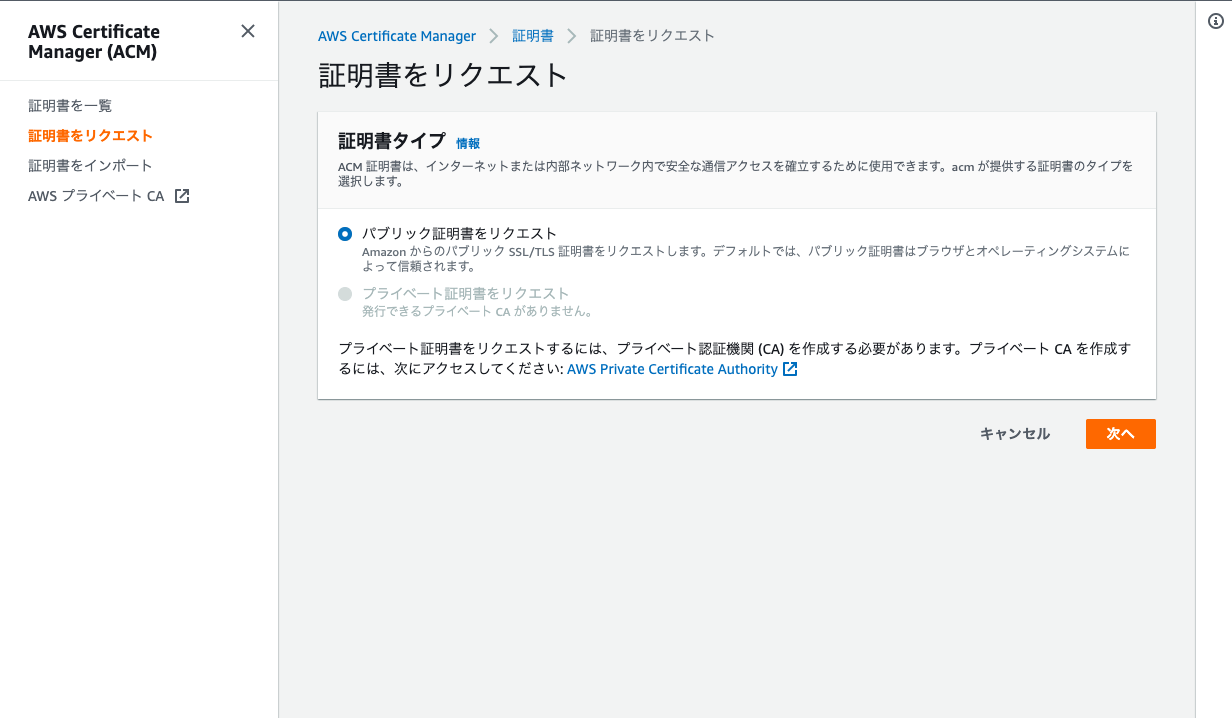 - 「パブリック証明書をリクエスト」を選択し、「次へ」をクリック。