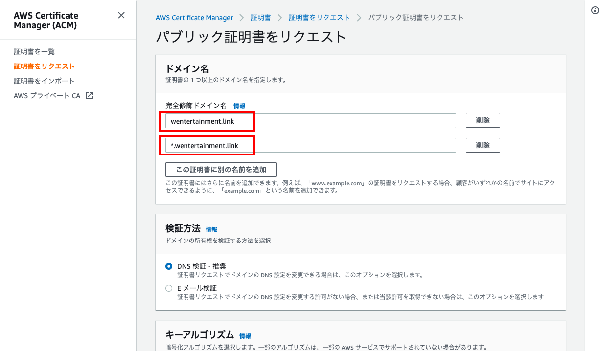 - 完全修飾ドメイン名にホストドメインを入力、サブドメインも利用する場合は、ワイルドカードを使って全てのサブドメインに対して証明書を要求すると良い。