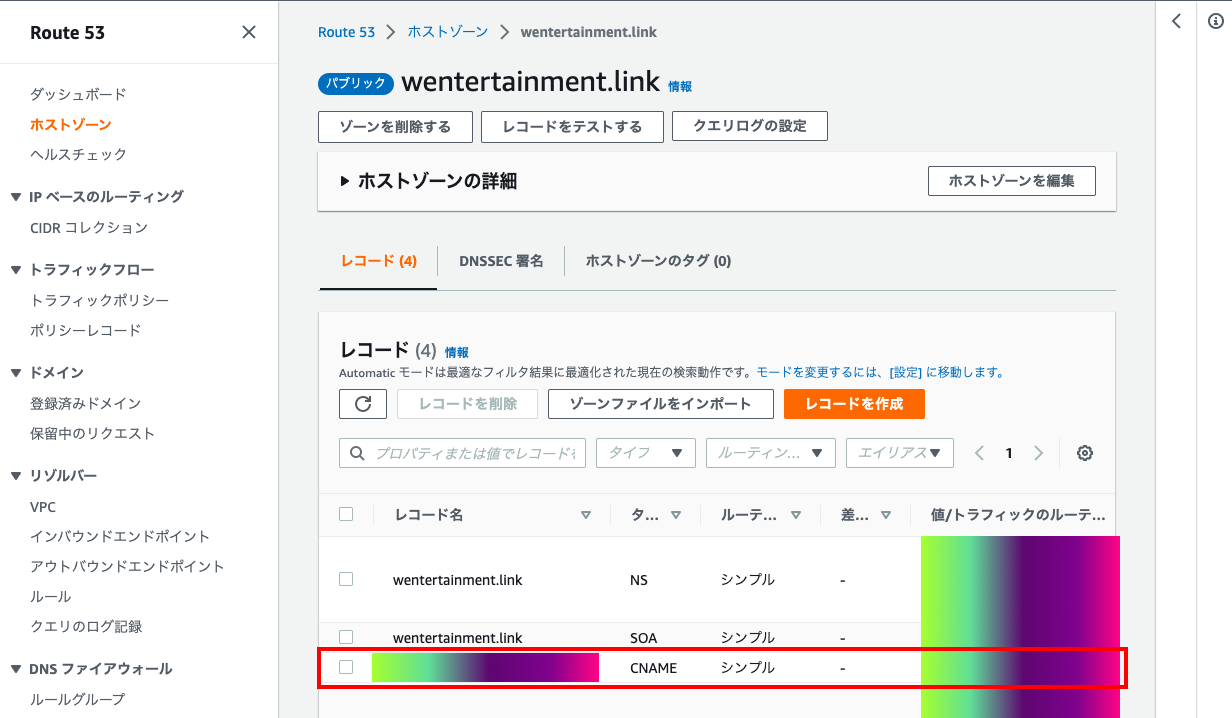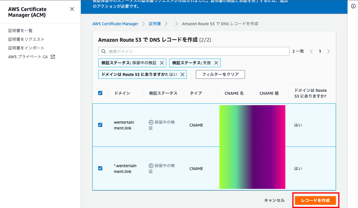 - このままだと「保留中の検証」のまま、しばらく待つ必要がある。一度、Route53にアクセスすると直ぐに検証が完了するという裏ワザがあるので、別タブでRoute53を開く。ホストドメインを選択して、作成したCNAMEレコードを確認する。